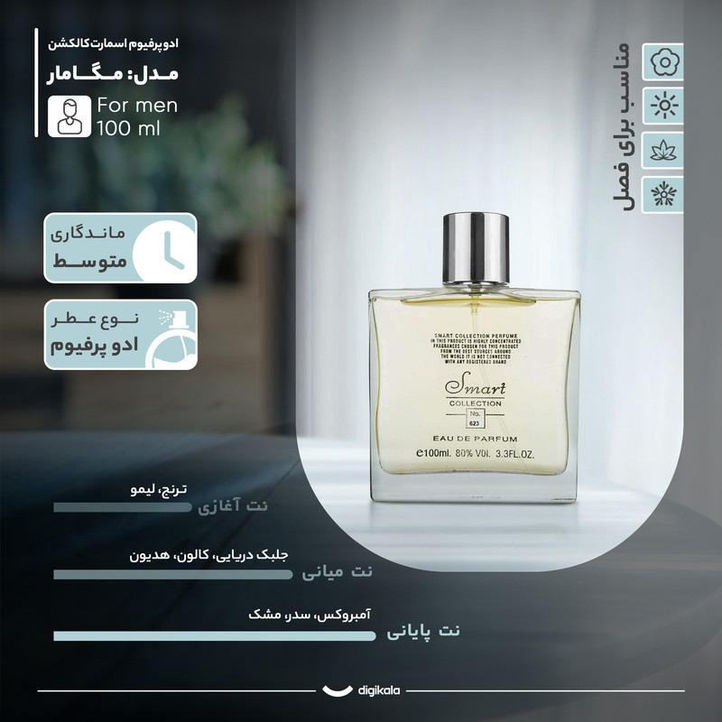 ادو پرفیوم مردانه اسمارت کالکشن مدل مگامار کد 623 با حجم 100 میلیلیتر، انتخابی منحصر به فرد برای مردانی است که به دنبال عطری با رایحه خنک و تلخ هستند. این عطر با طراحی شیشهای شیک و مدرن، حس خاصی از جذابیت و اعتماد به نفس را به شما منتقل میکند. نتهای آغازین شامل ترنج و لیمو، طراوت و انرژی را به ارمغان میآورند و فضایی شاداب و دلپذیر ایجاد میکنند. در نتهای میانی، جلبک دریایی، کالون و هدیون ترکیبی از طراوت و عمق را به عطر اضافه میکنند که حس تازگی و زندگی را به شما منتقل میکند. در نهایت، نتهای پایانی شامل آمبروکس، سدر و مشک، گرما و ماندگاری را به عطر میبخشند و تجربهای ماندگار و دلپذیر را رقم میزنند. با پخش بوی متوسط و ماندگاری مناسب، این ادو پرفیوم برای استفاده روزمره و مناسب برای تمامی فصول بهار، تابستان، پاییز و زمستان است. با اسمارت کالکشن مگامار، شما میتوانید در هر جمعی بدرخشید و با بوی خوش و دلپذیر خود، جذابیت و شخصیت خود را به نمایش بگذارید. این عطر، بهترین همراه شما در هر لحظه خواهد بود و حس خاصی از تازگی و شادابی را به زندگی شما میآورد.