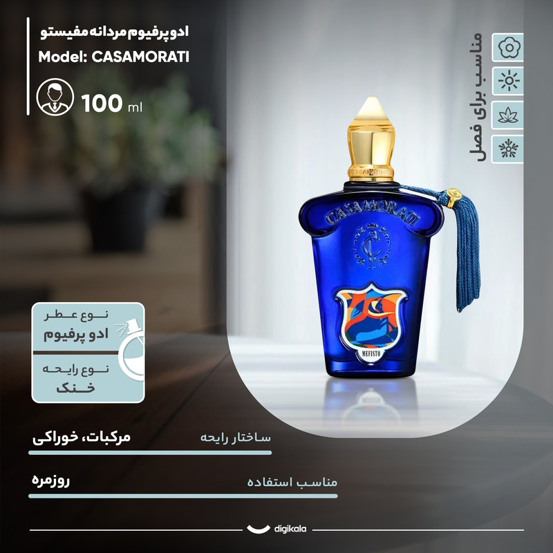 عطر MEFISTO CASAMORATI XERJOFF رایحهای باکیفیت، شاداب، مرکباتی و کمی پودری دارد. مفیستو مردانه با ترکیبی خاص و جذاب، حس تازگی و انرژی را منتقل میکند. حضور لوندر در ترکیباتش، علاوه بر طراوت، حس آرامش عمیقی ایجاد میکند. این عطر یکی از محصولات شاخص سری کازاموراتی است و از آن دسته رایحههایی نیست که بهسادگی فراموش شوند. استفاده از این ادوپرفیوم در قرارهای مهم و جلسات کاری، تصویری قدرتمند و ماندگار از شما به جا میگذارد. رایحهاش اصیل، باصلابت و کامل است.