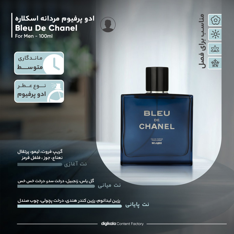 ادوپرفیوم اسکلاره مدل بلو دو شانل محصول جدید شرکت اسکلاره است.بلو دو شانل با حال و هوای شرقی و چوبیاش برای روزهای گرم و معتدل سال مورداستفاده قرار میگیرد؛ اما این به آن معنی نیست که در فصل زمستان نشود از بلو دو شانل استفاده کرد.رایحه این عطر آمیزهای از جوز، صندل، نعناع هندی، یاسمن، گریپ فروت، وتیور، بخور، فلفل صورتی، سدر، زنجبیل و دیگر مواد معطر چوبی است.