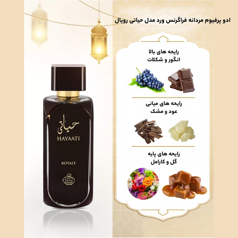 رایحه های بکار رفته در عطر ادکلن موصوف قهوه ای فراگرنس ورد hayaati royale رایحه خالص هستند که ماندگاری و پخش بوی بسیار بالایی دارند. رایحه اولیه ادکلن موصوف قهوه ای انگور و شکلات می باشد. این ترکیب شیرینی ملایمی به عطر می دهد و شادای و نشاط را برای شما به ارمغان می آورد. رایحه میانی از ترکیب عود و مشک تشکیل شده است . رایحه انتهایی و پایه گل و کارامل است که ماندگاری بالایی به عطر بخشیده است. عطر عربی موصوف قهوه ای متناسب با سلیقه آقایان و خانم های شیک و خوش سلیقه ای است به رایحه ادکلن های عربی علاقه دارند و برای خوش بویی خود اهمیت زیادی می دهند .