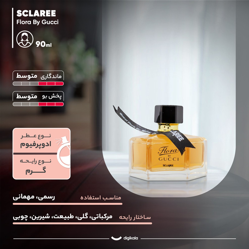 ادوپرفیوم زنانه Flora By Gucci محصولی جدید از برند اسکلاره است که ویژه بانوان دلربا و جذاب طراحی شده است. این عطر با ماندگاری بالا و پراکندگی مناسب، انتخابی عالی برای استفاده روزانه محسوب میشود. ترکیب منحصربهفرد آن از عصاره گلهای کمیاب و ارزشمند، رایحهای گرم و شیرین خلق کرده که بهویژه برای روزهای خنک بهاری بسیار پیشنهاد میشود. فلورا بای گوچی با رایحهای گلفام، حس لطافت، زنانگی و جذابیت را به بهترین شکل منعکس میکند.