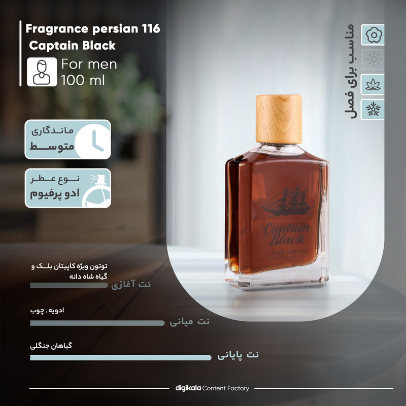 یکی از عطرهای مردانه و معروفی که در سالیان اخیر طرفداران زیادی پیدا کرده، «کاپتان بلک» (Captain Black) است. این پرفیوم 100 میلیلیتری با بوی تند و گرمش برای تمامی فصول بهویژه برای فصول سرد سال مناسب است. این عطر ارزانقیمت برای استفادههای مکرر و اصطلاحاً دمدستی گزینهی خوبی به نظر میرسد. اگر به بطری کاپتان بلک نگاه دقیقی داشته باشید، بهسرعت متوجه طراحی جذاب و مردانهی آن میشوید.. اگر این پرفیوم را روی پوست و در محل نبضتان اسپری کنید، خیلی سریع متوجه بوی توتون ویژه کاپیتان بلک خواهید شد. بوی این توتون با تندی، شیرینی و گرمایش هیجان و انرژی زیادی را به شما منتقل میکند. پس از مدتی، نتهای پایانی جای نتهای آغازی را میگیرند. این نتها از ترکیب گیاهان جنگلی تشکیلشدهاند. آرامش و تمرکزی که از این ترکیب میگیرید، تا مدت زیادی ماندگار خواهد بود. خرید عطر کاپتان بلک با توجه به محبوبیت فوقالعاده در تمام دنیا، بوی تند و فراگیر و قیمت منطقی و نهچندان بالایش برای شما به خاطرهای شیرین تبدیل خواهد شد.