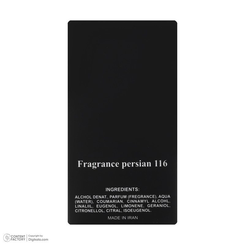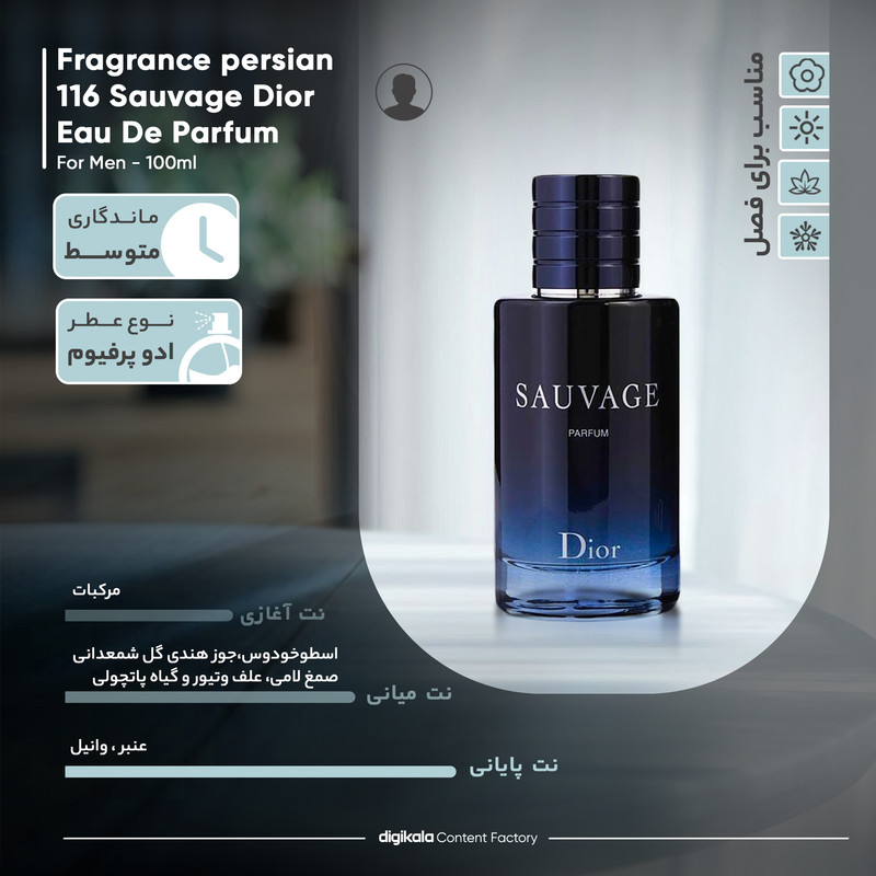 ادو پرفیوم مردانه فراگرنس پرشیا 116 مدل ساواج دیور یک عطر شرقی و معتدل برای مردان است. این عطر با ترکیبی از نتهای مانند چرم، عنبر، وانیل و گل رز، حس لطیف و دلنشینی را برای شما به ارمغان میآورد. با ترکیبی منحصر به فرد از عناصر مختلف، این عطر مناسب برای استفاده در مهمانیها، ملاقاتهای رسمی یا حتی استفاده روزمره است. به عنوان یک عطر جذاب، ادو پرفیوم مردانه فراگرنس پرشیا 116 مدل ساواج دیور میتواند افزون بر جذابیت شما، اعتماد به نفس و شخصیت شما را نیز تا حد زیادی افزایش دهد.