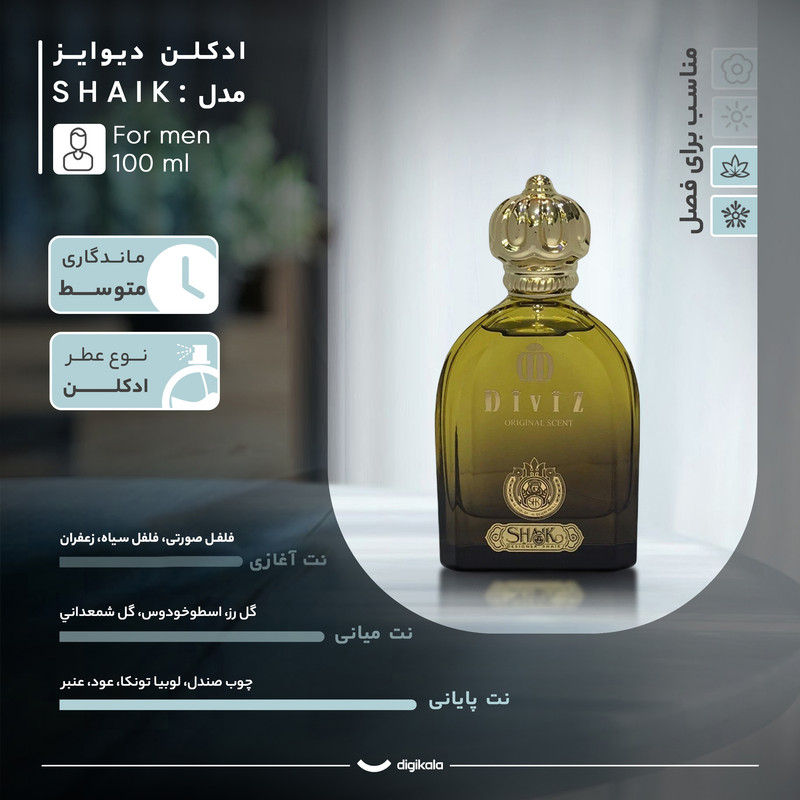 ادکلن مردانه دیوایز مدل SHAIK با حجم 100 میلیلیتر، انتخابی استثنایی برای مردانی است که به دنبال عطری با رایحه گرم و شیرین هستند. این ادو پرفیوم با طراحی شیشهای شیک و مدرن، حس خاصی از لوکس بودن و جذابیت را به شما منتقل میکند. نتهای آغازین این عطر با فلفل صورتی، فلفل سیاه و زعفران آغاز میشوند که طراوت و انرژی را به ارمغان میآورند و فضایی پر از هیجان و جذابیت ایجاد میکنند. در نتهای میانی، ترکیبی از گل رز، اسطوخودوس و گل شمعدانی، لطافت و عمق بیشتری به عطر میبخشد و حس آرامش و شیک بودن را منتقل میکند. در نهایت، نتهای پایانی شامل چوب صندل، لوبیا تونکا، عود و عنبر، گرما و ماندگاری را به عطر اضافه میکنند و تجربهای ماندگار و دلپذیر را برای شما رقم میزنند. با پخش بوی متوسط و ماندگاری مناسب، این ادکلن برای استفاده روزمره و مناسب برای فصول پاییز و زمستان طراحی شده است. با دیوایز SHAIK، شما میتوانید در هر جمعی بدرخشید و با بوی خاص و دلپذیر خود، جذابیت و شخصیت خود را به نمایش بگذارید. این عطر، بهترین همراه شما در هر لحظه خواهد بود و حس خاصی از شیک بودن و اعتماد به نفس را به زندگی شما میآورد.